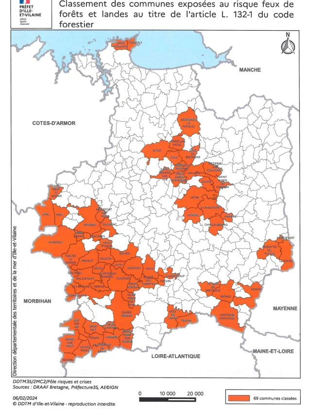 ⚠ À compter du jeudi 17 juillet 2025, un arrêté préfectoral d’Ille et Vilaine interdit temporairement tout accès, stationnement, circulation et présence de personnes (piétons, cyclistes, et autres) dans les bois, forêts et landes dans les communes exposées au risque feux de forêts et landes, ici représentées en orange sur la carte. Cet arrêté est applicable jusqu’au dimanche 20 juillet 2025 à 06h00.